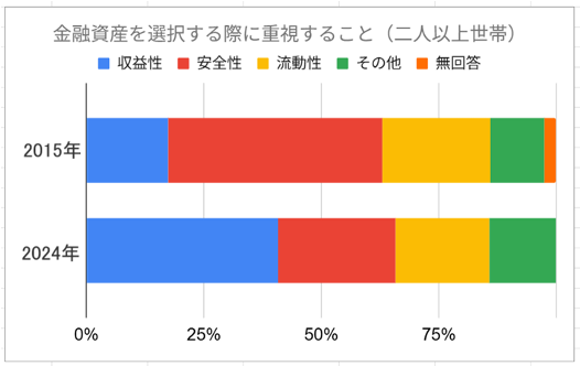 金融経済教育推進機構(J-FLEC)の「家計の金融行動に関する世論調査(2024年)」によると、投資家の商品選びに変化が見られます。従来、日本では金融商品を選ぶ際に「安全性重視」、つまり利回りは低くても元本割れしにくい商品が好まれてきました。しかし、直近の調査では「収益性重視」と回答した世帯が4割を超え、投資の意識転換が進んでいます。